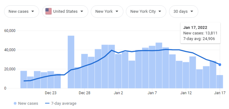 My current sense is that Omicron cases will likely peak by late January, and we should see them start to go down by mid-February (90% confidence). We can see this from New York